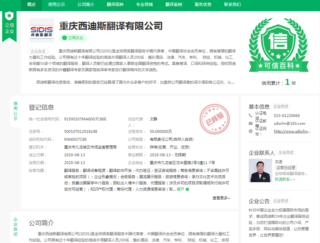 基于重慶西迪斯翻譯有限公司(簡稱:西迪斯翻譯)的良好口碑及客戶的高度評價,經“企業百姓百科”“憑安信用”及人民銀行上海總部備案的“企業征信機構”授權,重慶西迪斯翻譯有限公司被授予“立信企業”榮譽稱號,并在360官方網站進行推薦。