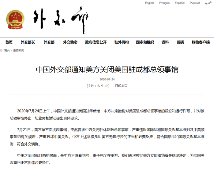 重大事件:中國外交部通知美方關(guān)閉美國駐成都總領(lǐng)事館!!