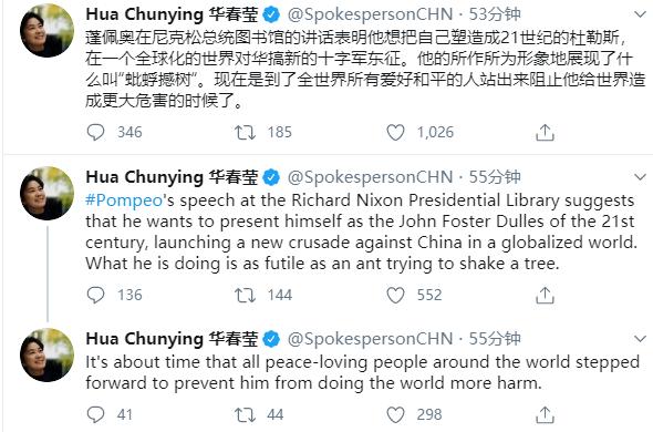 在如今美國剛宣布關閉中國駐休斯敦總領館,蓬佩奧接著又大放厥詞,對中國內政外交進行污蔑,對此,美媒將蓬佩奧的此番發言預測描述為“新冷戰檄文”的演講。面對蓬佩奧如此咄咄逼人,我國外交部發言人華春瑩在推特上火力全開,用中英雙語對蓬佩奧的言論展開回擊。