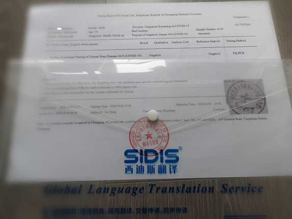 因為要去別的國家入境需要出具72小時的核酸檢測報告,比如去柬埔寨、孟加拉、印尼、泰國、迪拜,埃塞俄比亞,馬來西亞,歐美等國家就需要英文版的核酸檢測報告,因為的核酸檢測報告一般都是中文的,那哪里可以做英文版的核酸檢測報告呢?很多出國旅客朋友問找翻譯公司翻譯成英文報告能不能用?答案是必須的,必須有國內的專業翻譯公司翻譯,公司名稱必須是重慶XX翻譯有限公司,別的文化公司,傳媒公司翻譯的都是不支持的,因為他們不是正規、專業的翻譯公司,所以提醒大家一定、務必找專業正宗的翻譯公司翻譯。甚至有的人覺得翻譯很簡單,自己翻譯,即快捷還省錢,已經多次出現自己翻譯被國外海關遣返的情況,風險極大,所以在此提醒大家一定要找專業、正規的翻譯公司翻譯,翻譯件還必須加蓋翻譯公司的專用章、提供翻譯公司的有效營業執照證明。建議大家有必要電聯“西迪斯翻譯”這樣專業的翻譯公司為您服務或者解答問題。